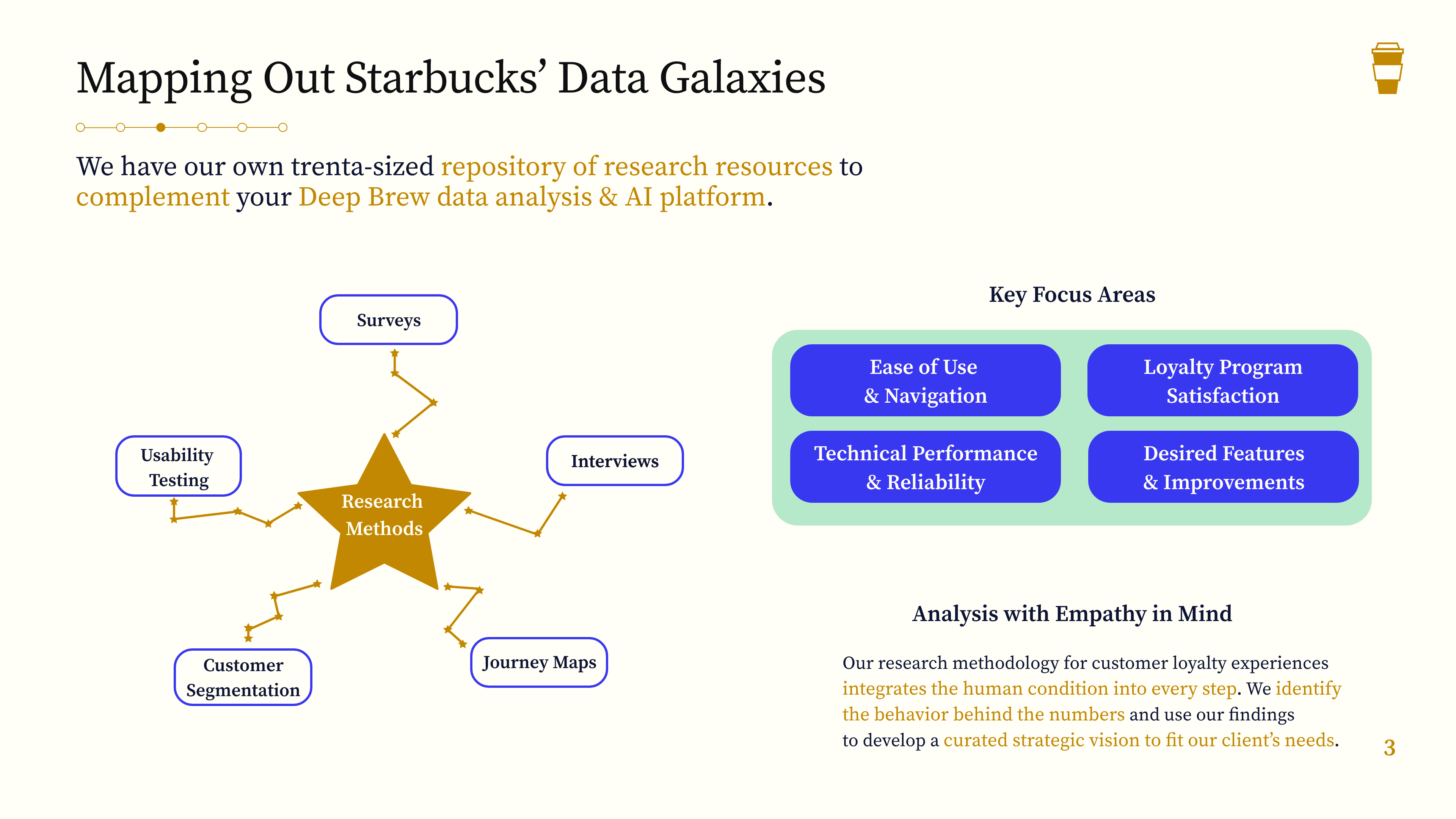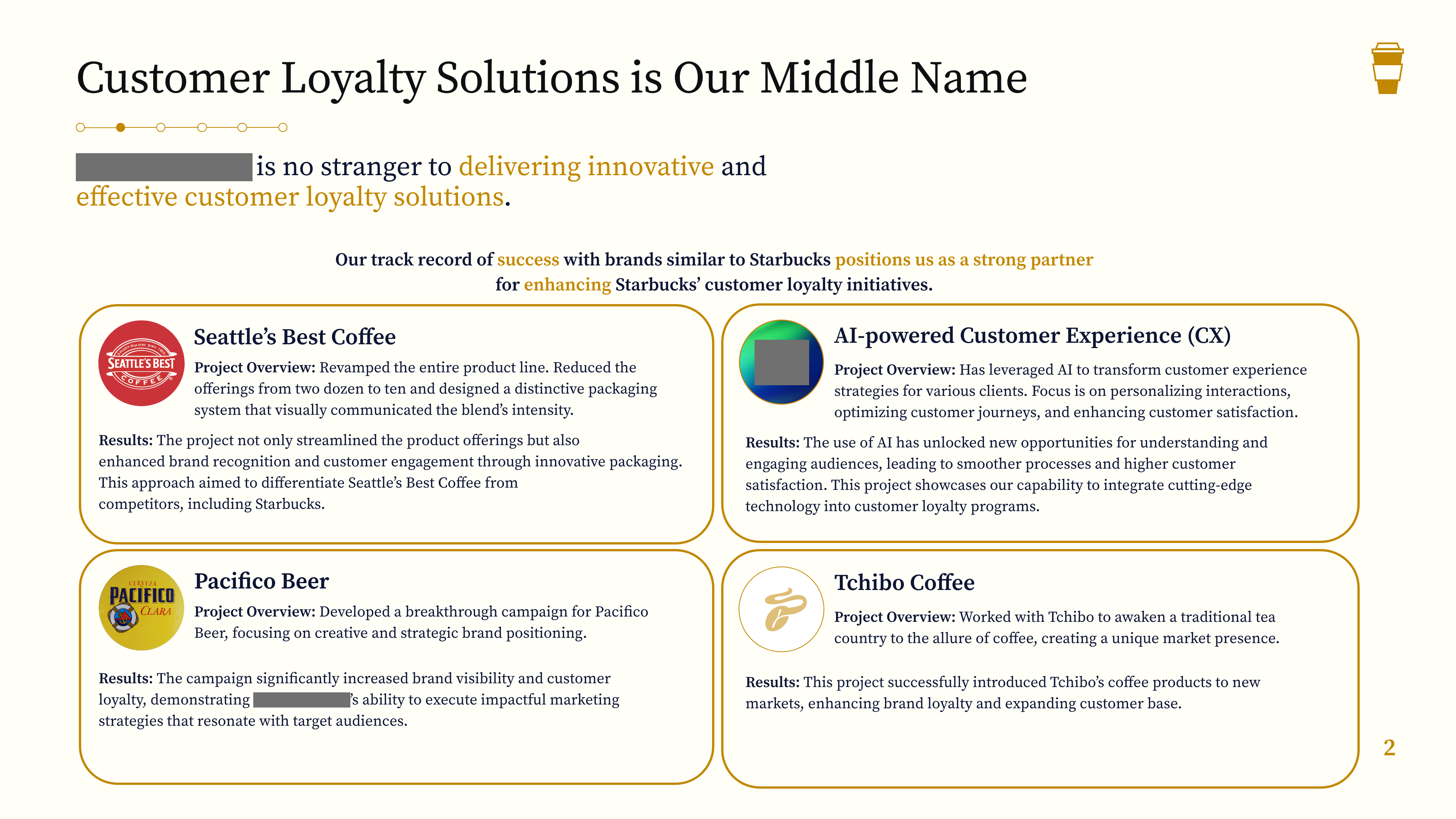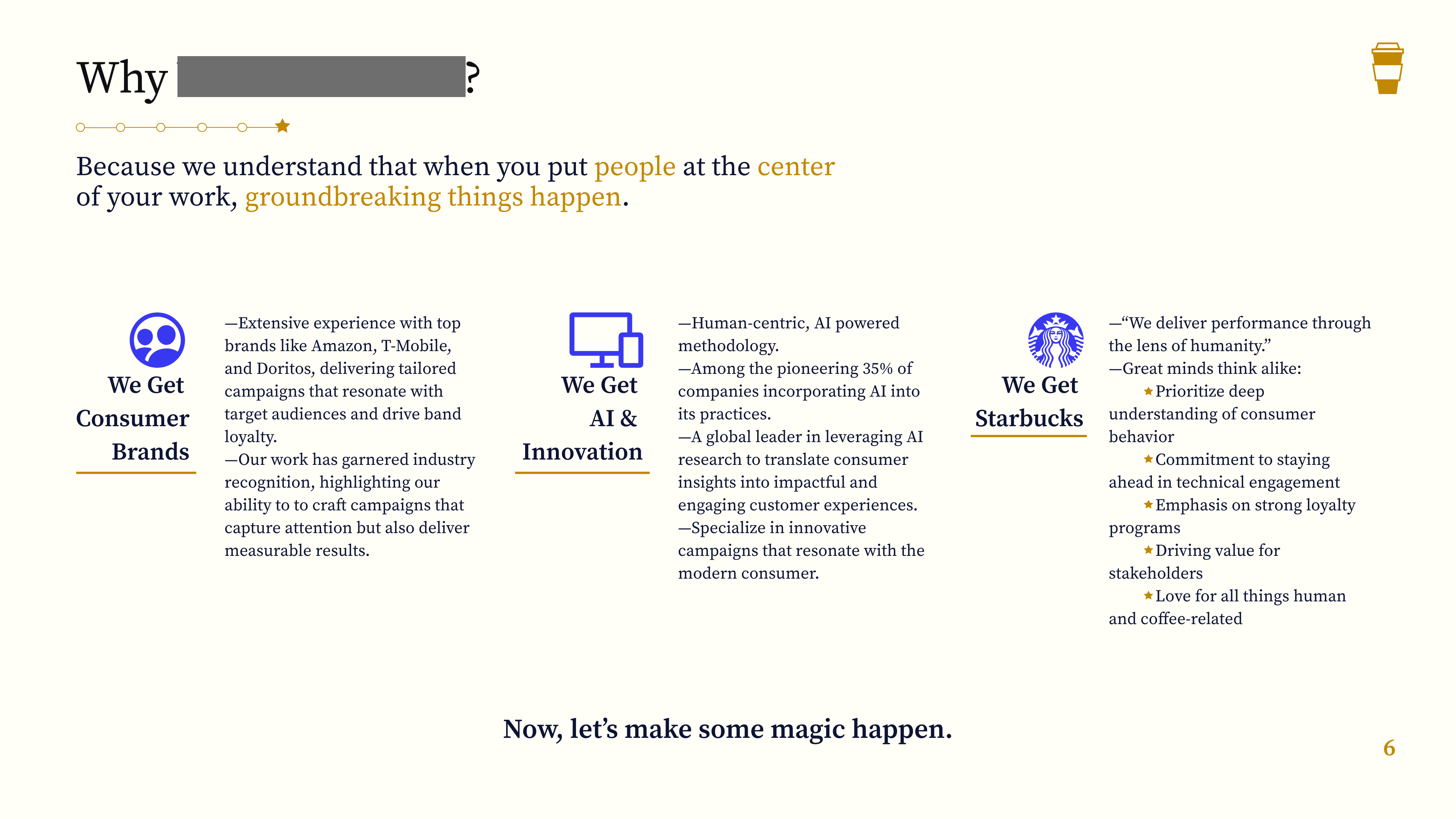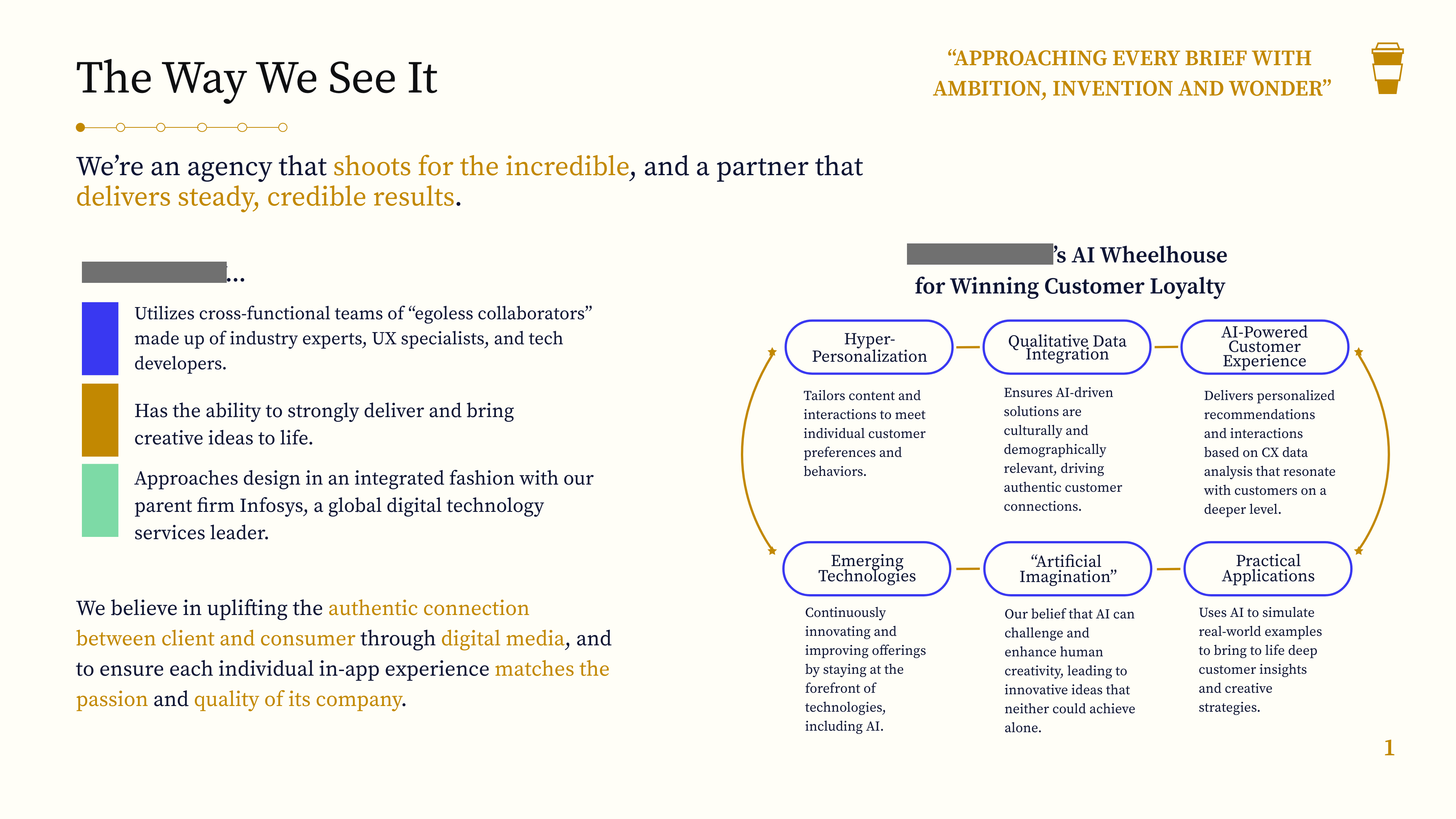 Samples of de-identified pitch and business development research decks created for prospective agency services.